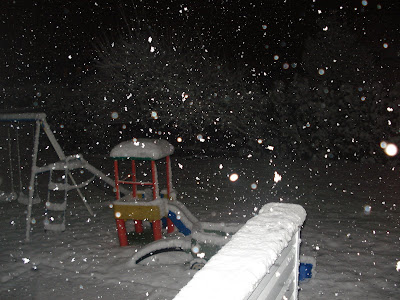 Just thought I'd share these pictures I just took of the back yard. It's still snowing. It started earlier this evening around 6ish and hasn't quit. Look at the play structure, how much snow has accumalated from 6-11pm. Even on the tricycle's handle bars.